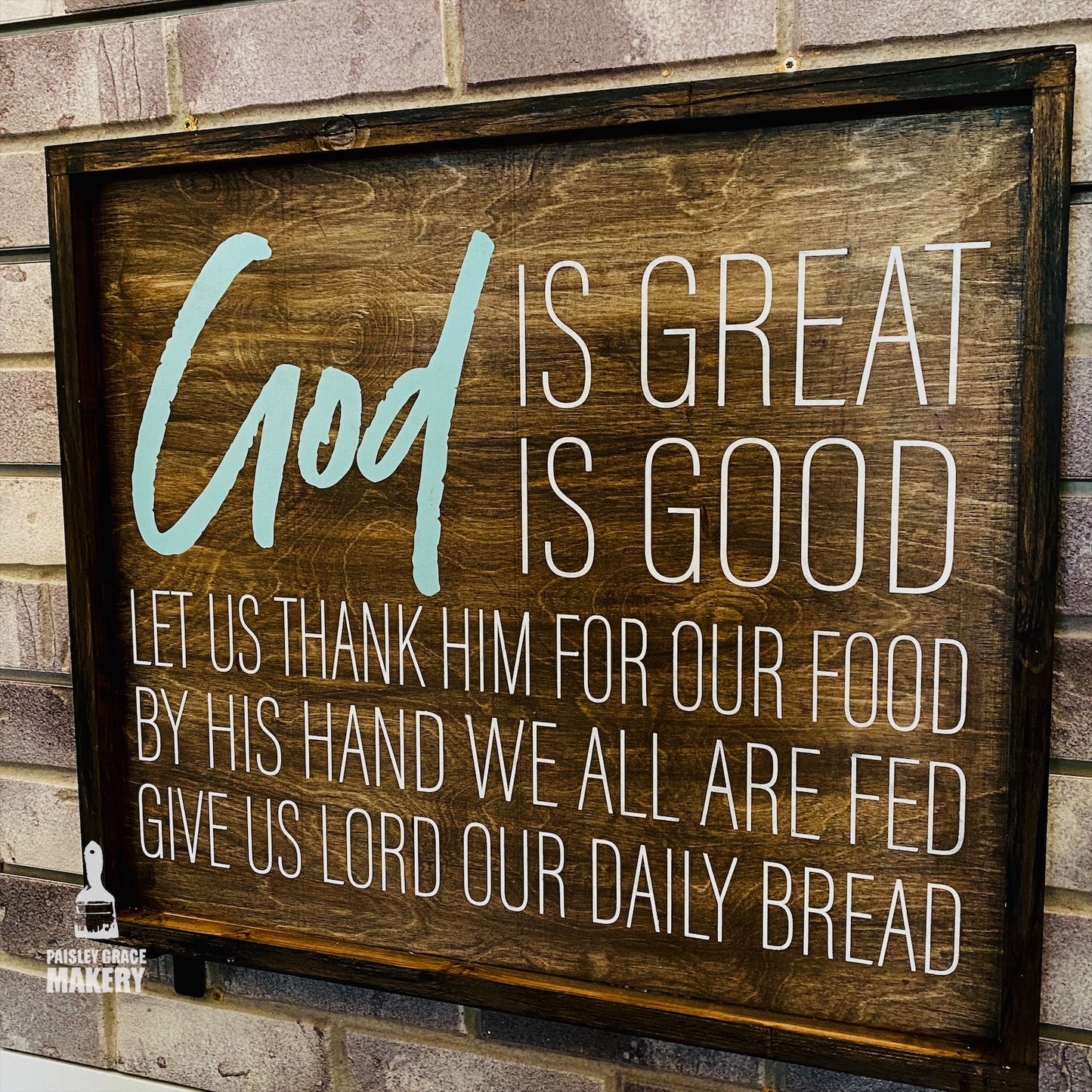 This rustic home decor brings faith into your home. With an inspiring prayer printed on a rectangle, God is great and God is good! Give your home a spiritual touch with this unique and meaningful piece.